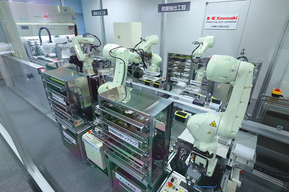 The system automates all the procedures required for PCR testing, such as inactivating samples, extracting their nucleic acid, and subjecting them to PCR inspection. The industrial robot technology developed by Kawasaki Heavy Industries enables robots to accomplish those precise motions.