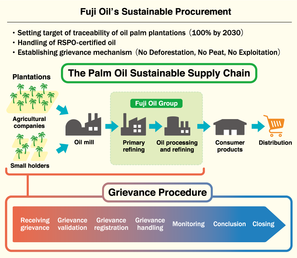 In 2016, the company established the Responsible Palm Oil Sourcing Policy, setting out its commitment to NDPE—No Deforestation, No Peat, No Exploitation. They particularly focus on a commitment to human rights issues. In 2018, Fuji Oil then created a grievance mechanism that enables complaints to be lodged concerning any human rights or environmental issues in the supply chain. A mechanism has thus been put in place to encourage poorly performing suppliers to improve their actions, ultimately leading to the suspension of dealings with those suppliers who fail to improve.