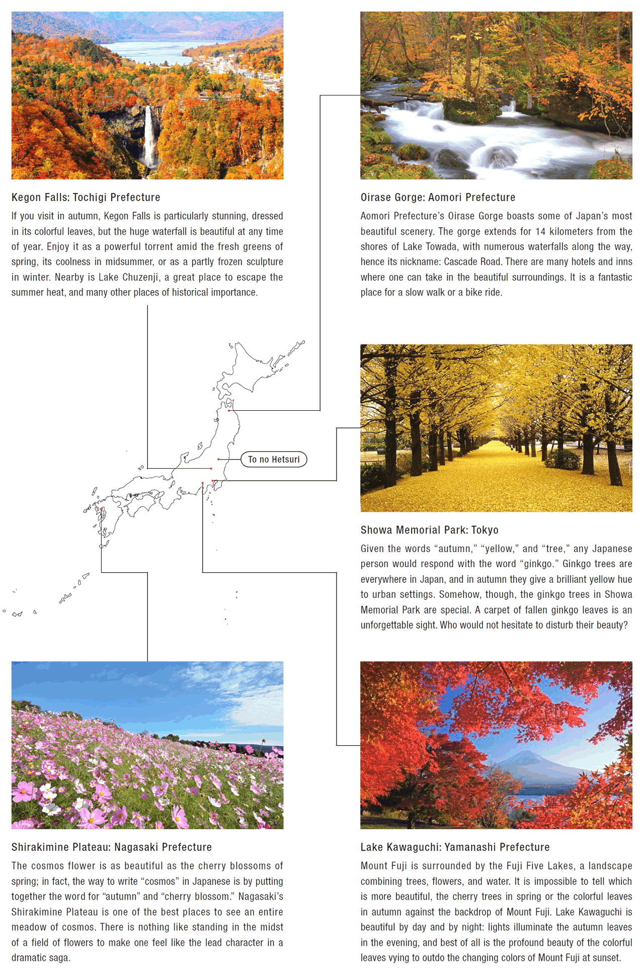 For autumn we have yellow and red. These colors have strong associations with the season: Yellow is for gold, the colorof gingko nuts and ripe grain, and red comes from the colors of the autumn foliage.