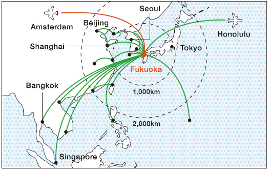 Ideally located in close proximity to other countries, Fukuoka has a long history as a gateway for trade and interchange with the world. Fukuoka's Port of Hakata is an international seaport servicing thirty-nine routes. It boasts faster shipping than any other major port in Japan, making it a perfect base for distribution, particularly in trade with other Asian countries. In addition, Fukuoka has one of the most easily accessible international airports in the world—only 10 minutes by subway from downtown. And being near other Asian countries makes the city an ideal business hub—traveling to another major city in East Asia is just as easy as traveling to Tokyo. The airport also offers regular international flights to countries beyond East Asia, connecting to nearly twenty cities across the globe, including in the United States and Europe.