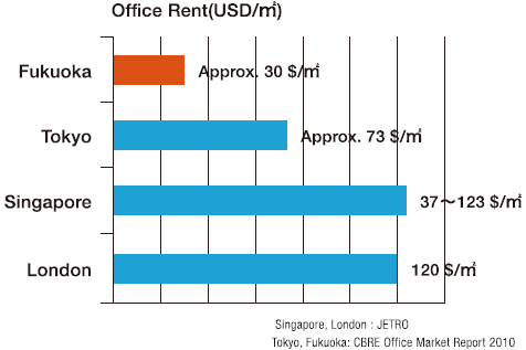 With office rents a third of those in Singapore or London, and half of those in Tokyo, Fukuoka’s low office rents let businesses save on expenses. Fukuoka offers an ideal living environment for foreigners; including advice for international visitors and residents, multilingual maps, signs, and public facility information, and an outstanding educational environment, with Japanese classes for all ages and globally aware schools for young learners.