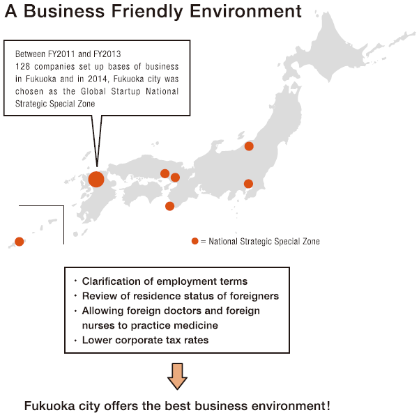 In 2014, Fukuoka was selected as a National Strategic Special Zone for Global Startups and Job Creation, one of the new strategic special zones created by the national government to boost local economics, and efforts to further support startups are being accelerated. Fukuoka is also implementing several policies to encourage people from other countries to set up businesses in Japan. The city is working toward simplifying the procedures required to start a business, and offering an incentive to companies that establish their headquarters in the city within five years of their founding: a reduced effective corporate tax rate on par with that of Singapore (17 percent) the lowest rate among the major countries of Asia. In addition, Fukuoka is also working to simplify immigration procedures and ease visa requirements.