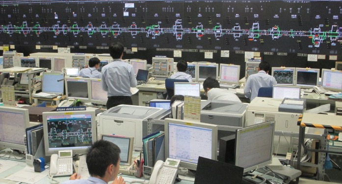 The view inside the Shinkansen General Control Center. Thanks to the support of its staff and the expertise of the highly qualified operators, the Shinkansen maintains reliable service on a tight schedule of departures at three-minute intervals.