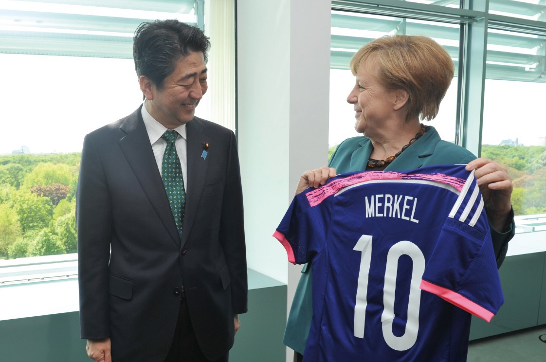 German Chancellor Angela Merkel receives a personalized uniform of the Japan women’s national soccer team during the Japan-Germany Summit Meeting.