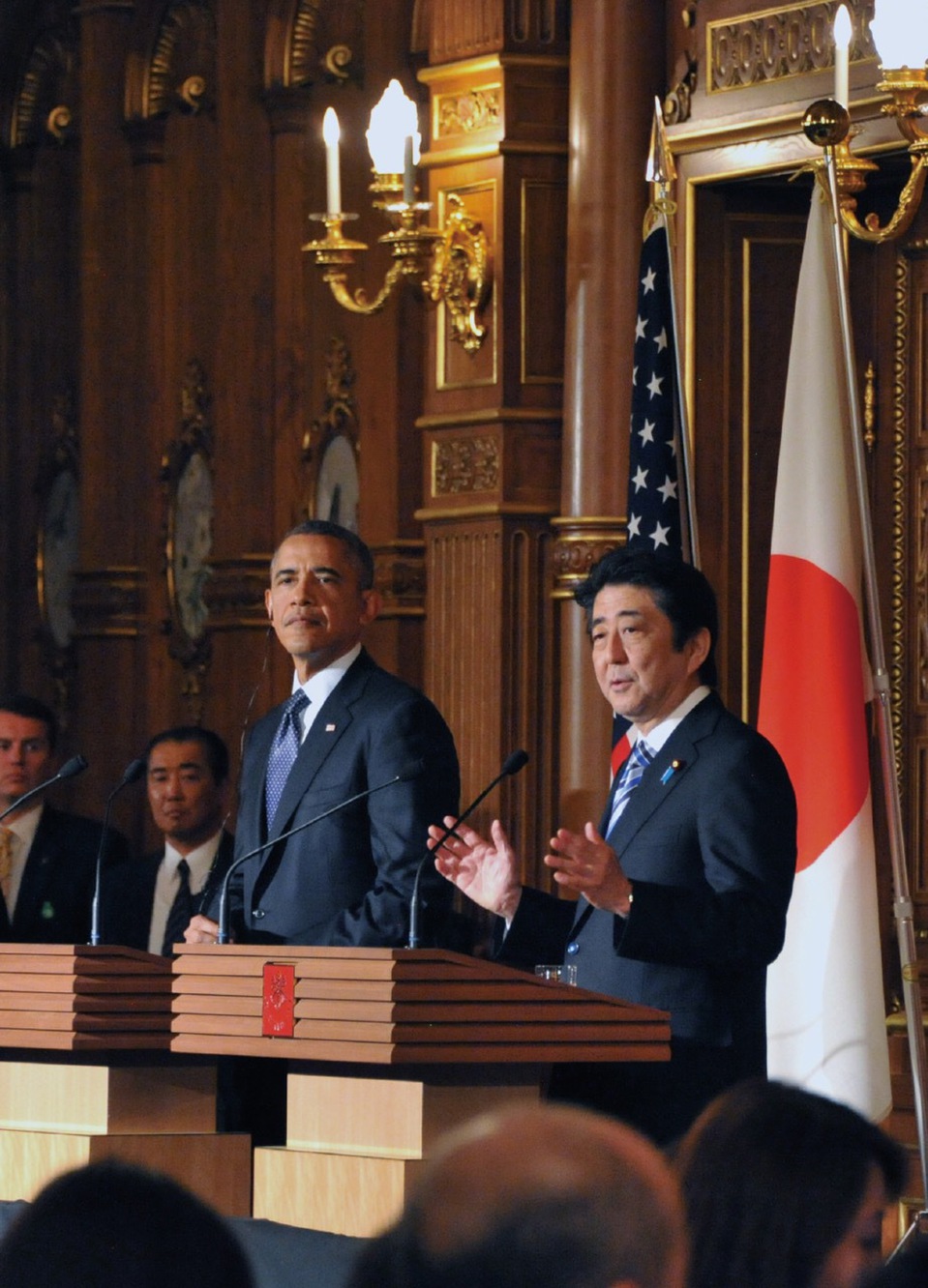 Shaking hands with President Obama at Japan-U.S. Summit Meeting.