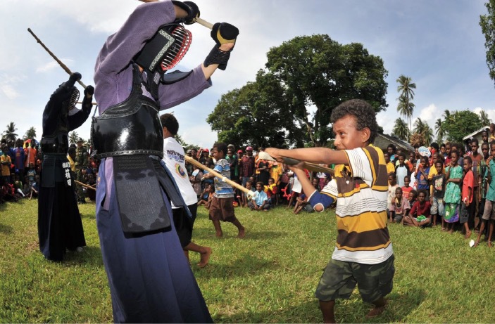 Introducing Japanese culture to local elementary school pupils through kendo (a Japanese martial art).
