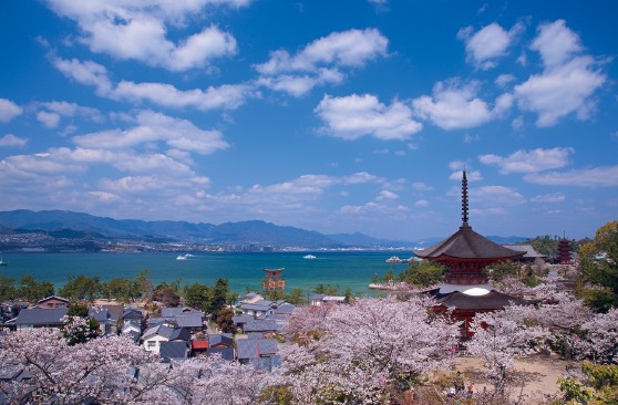 Miyajima of Hatsukaichi is one of the so-called three most famous landscapes of Japan, along with Matsushima in Miyagi Prefecture and Amanohashidate in Kyoto Prefecture. Although no festival is held, about 1,600 cherry trees bloom on the entire island of Miyajima, heralding the spring. On the premises of the Itsukushima Shinto Shrine, in the vicinity of the pagoda or the Museum of Treasures located on the western hill, you can enjoy a splendid view of the “floating” Torii Gate through Yoshino cherry blossoms when they are in full bloom.