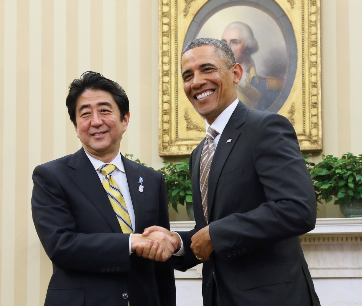 Shaking hands with U.S. President Barack Obama during a Japan-United States Summit Meeting, February 2013.