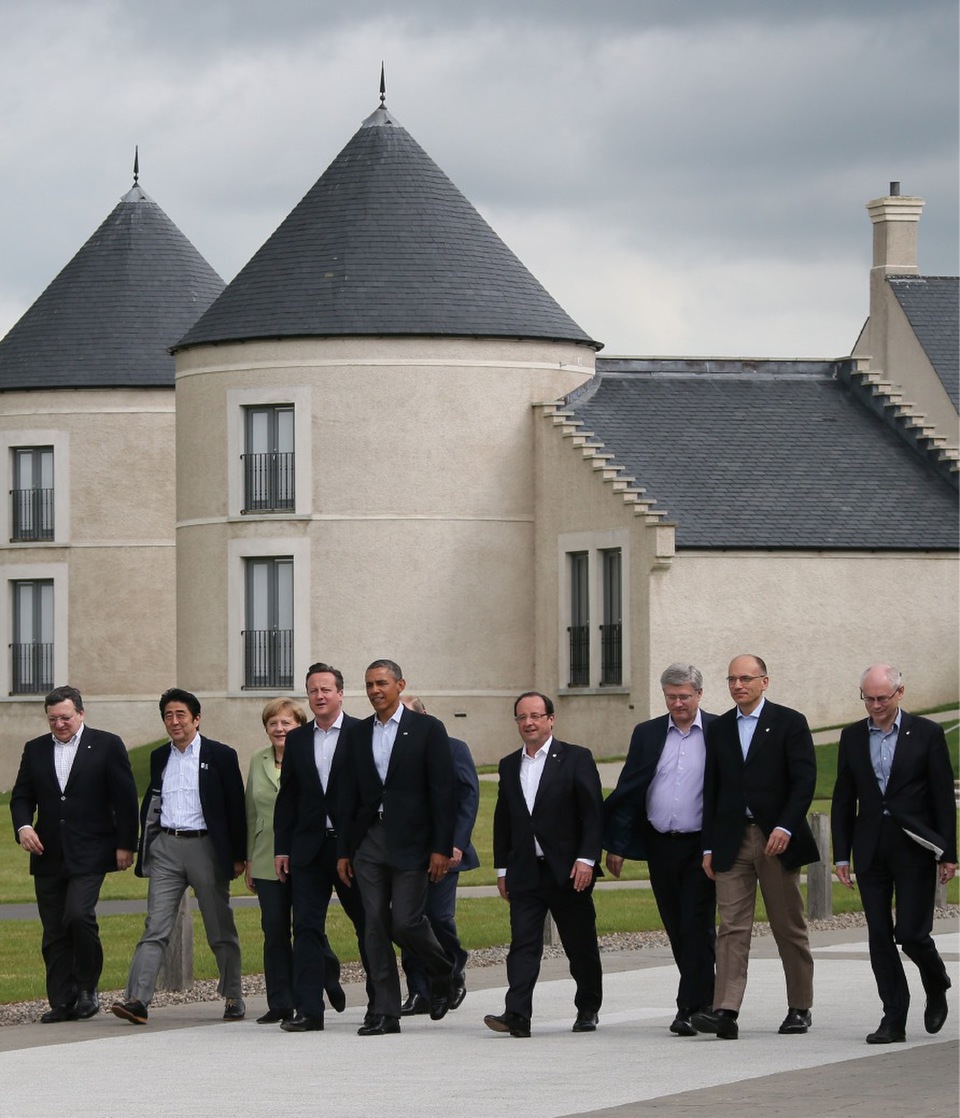 The Prime Minister walking with other leaders at the G8 Lough Erne Summit, in Northern Ireland, June 2013.