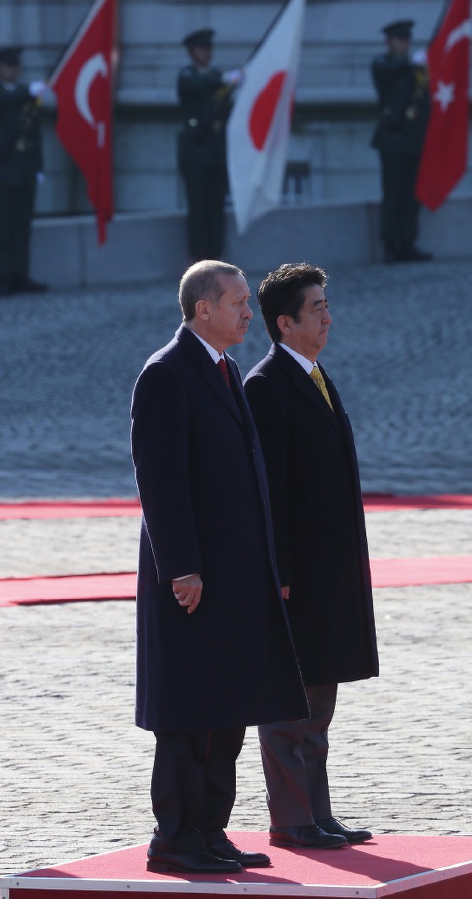 The Prime Minister and Prime Minister of Turkey Recep Tayyip Erdogan at the honor guard, part of the welcoming ceremony at the Japan-Turkey Summit Meeting, January 2014.