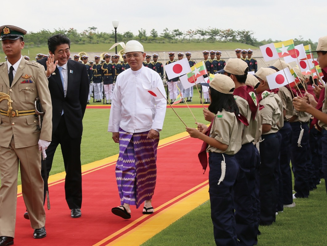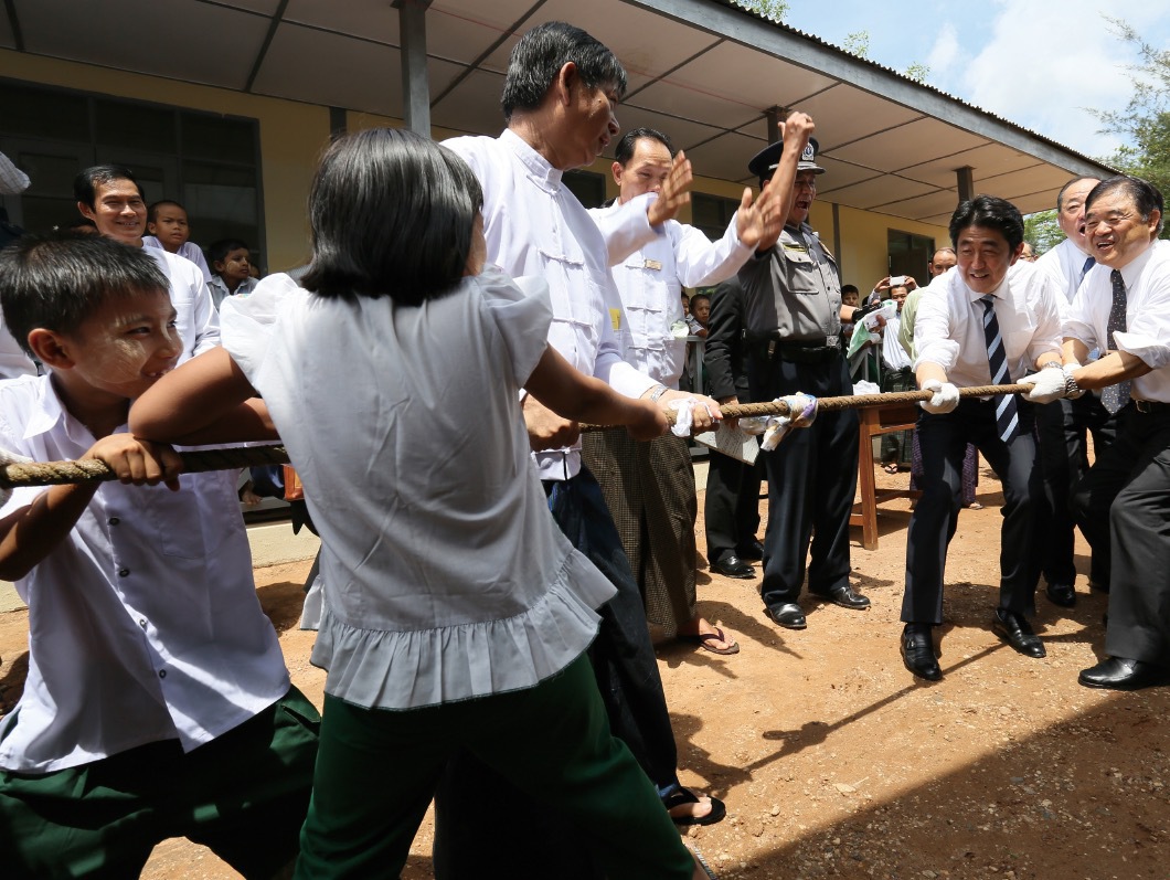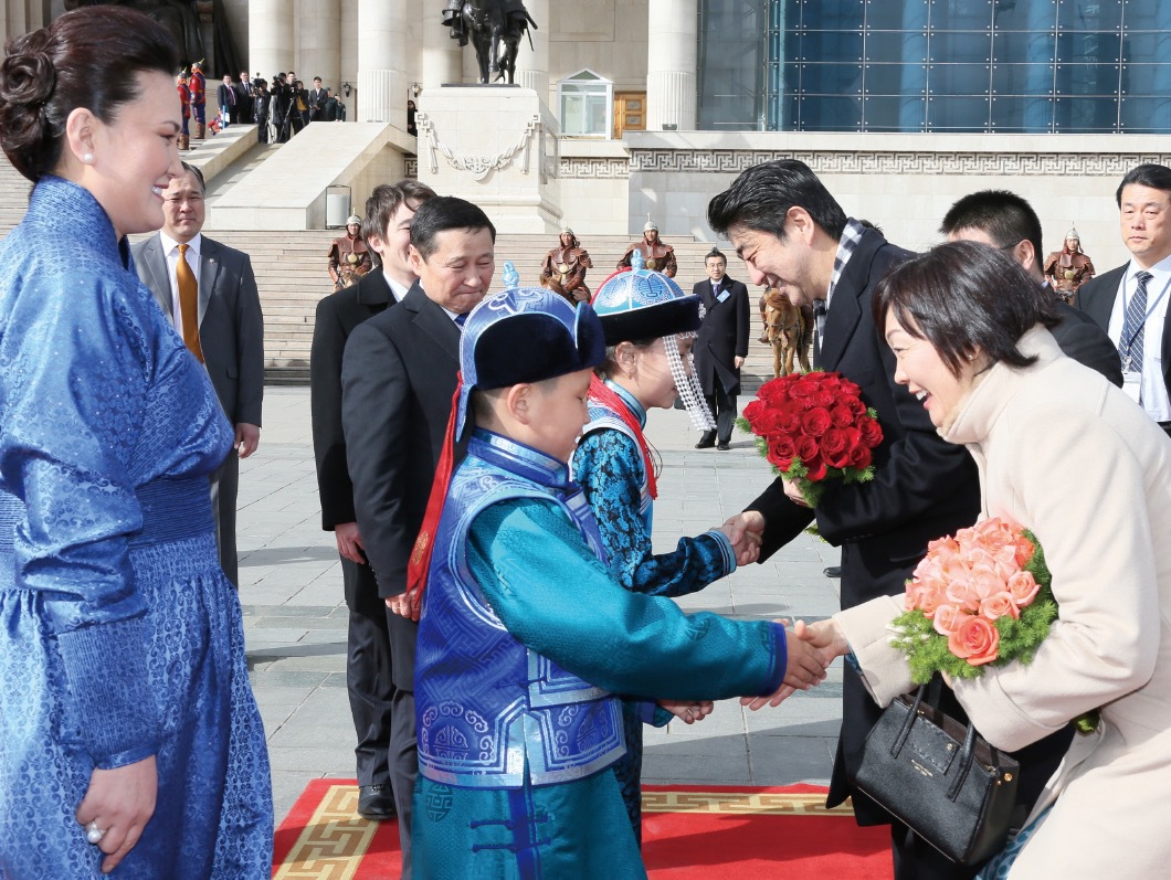 At an elementary school in Let Yet San village in Myanmar, the prime minister played tug of war with the children, May 2013. 6.Beautifully dressed children welcoming the prime minister and his wife with bouquets at the airport in Côte d’Ivoire, January 2014.