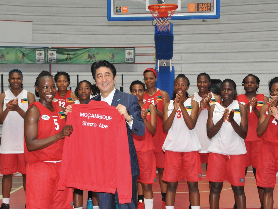 The prime minister meeting members of national women’s basketball team in Mozambique, where he was given a uniform with his name inscribed on it, January 2014.