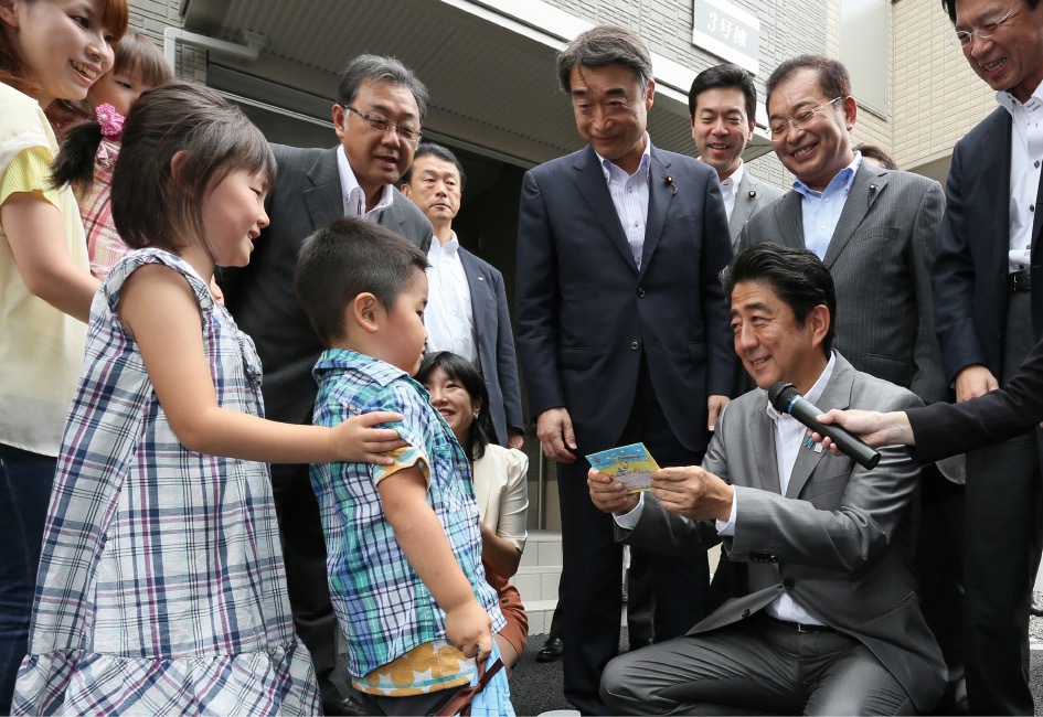 Receiving a letter from children during his observation tour of public housing for disaster victims in Miyagi Prefecture, July 2013.