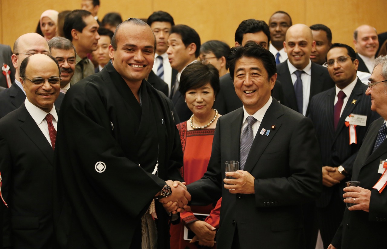 With diplomats resident in Tokyo from various Muslim countries at the iftar (the evening meal to break the fast) held by the Prime Minister at the close of Ramadan. The kimonoed man on the Prime Minister’s left is Osunaarashi from Egypt, the first sumotori from Africa and from a Muslim country in professional sumo, Japan’s national sport, July 2013.