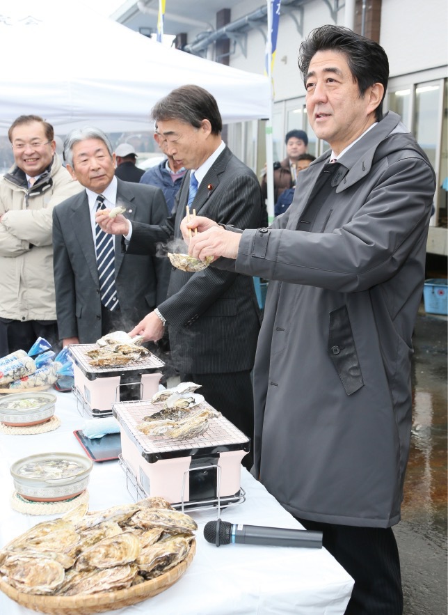 The Prime Minister is seen helping to promote the recovery of the oyster industry by sampling some oysters at a new oyster-processing plant in Ishinomaki City, which suffered considerable damage from the Great East Japan Earthquake, December 2013.