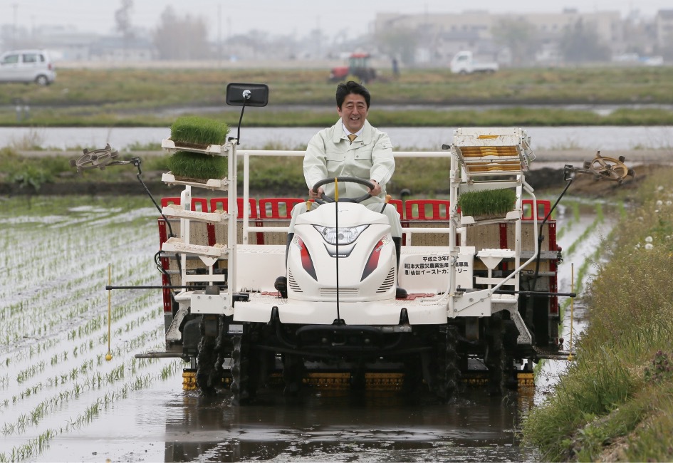 Rice paddies that took in seawater damage from the tsunami of March 2011 in Sendai City, Miyagi Prefecture, have been restored. Here the Prime Minister rides a tractor to help with planting the paddies, May 2013.