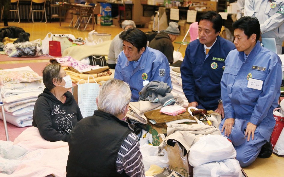 Visiting a shelter for displaced persons during his observational tour of the great rainstorm damage in Izu-Oshima, October 2013.