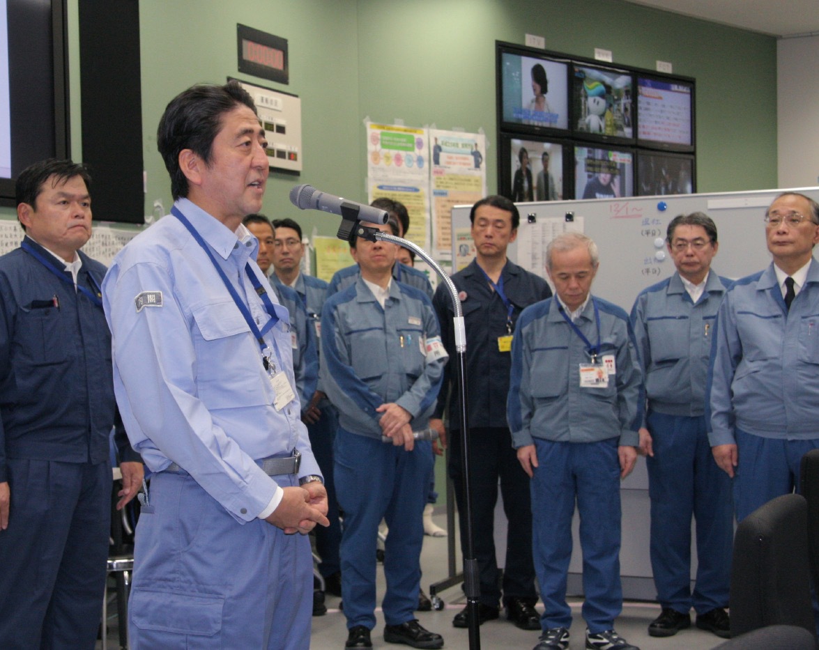 Offering encouragement to local staff during his visit to the Fukushima Daiichi Nuclear Power Station. He also observed the reactor