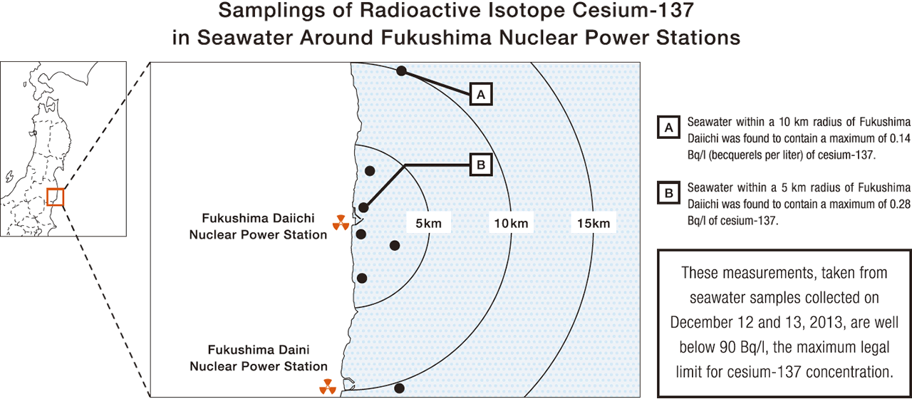 Meanwhile, the government has been monitoring radiation levels in seawater and elsewhere in the environment constantly for more than two years under the Comprehensive Radiation Monitoring Plan. As of the end of July 2013, there were no longer major fluctuations in the monitoring results, but the government is also enhancing its seawater monitoring in line with the points raised by the IAEA.