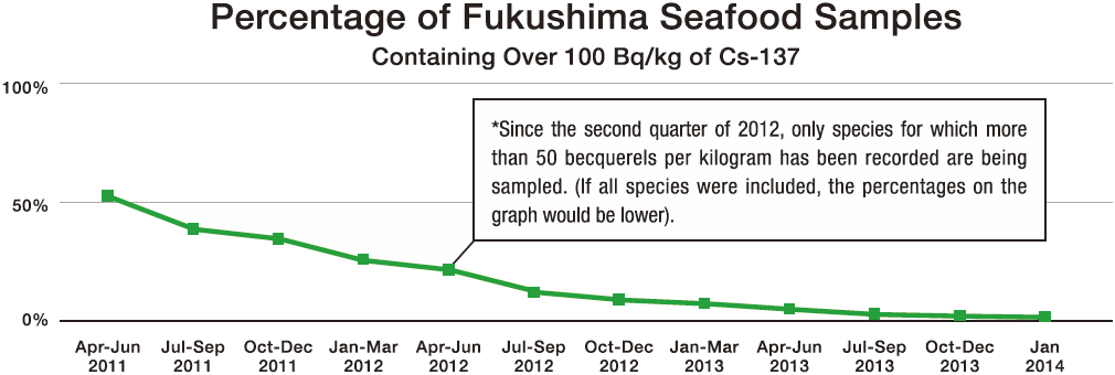 In addition, the Fisheries Agency continues to conduct sampling tests of marine products about once a week at Fukushima Prefecture’s major ports. The share of sampled products with radiation exceeding safety standards, which was 53% as of April–June 2011, has fallen substantially, to 1.9% as of October–December 2013. The Japanese government publishes new information on the nuclear power facilities and contaminated water as it becomes available from its ministries and agencies on the websites described below.