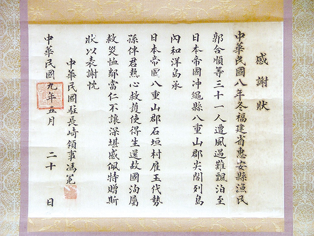 In 1920, after a group of Chinese fishers washed ashore and were rescued in the Senkakus, the consul of the Republic of China in Nagasaki Prefecture sent letters of appreciation to each of the Senkaku residents and other Japanese in Okinawa who were involved in the rescue; the letters explicitly indicate the Senkakus Islands as being part of Okinawa. The Japanese residents of the Senkakus thus played a part in building friendship between Japan and China.