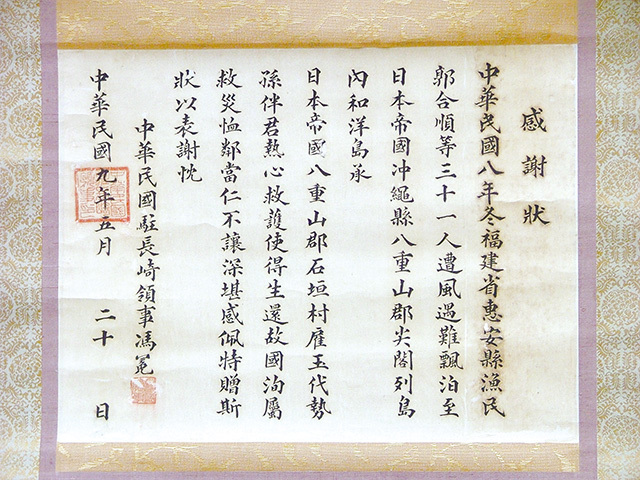 Chinese consul’s 1920 letter of appreciation for the rescue of 31 fishermen washed ashore in the “Senkaku Islands, Yaeyama District, Okinawa Prefecture, Empire of Japan.”