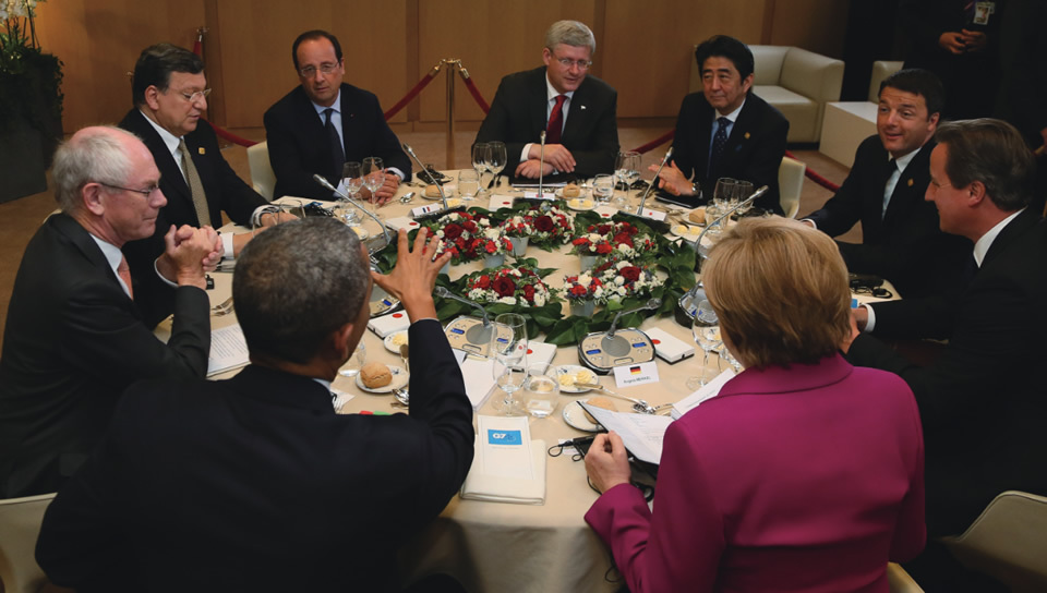 Joining hands with European Council President Herman Van Rompuy and European Commission President José Manuel Barroso during the G7 Meeting in Brussels, Belgium, June 2014.