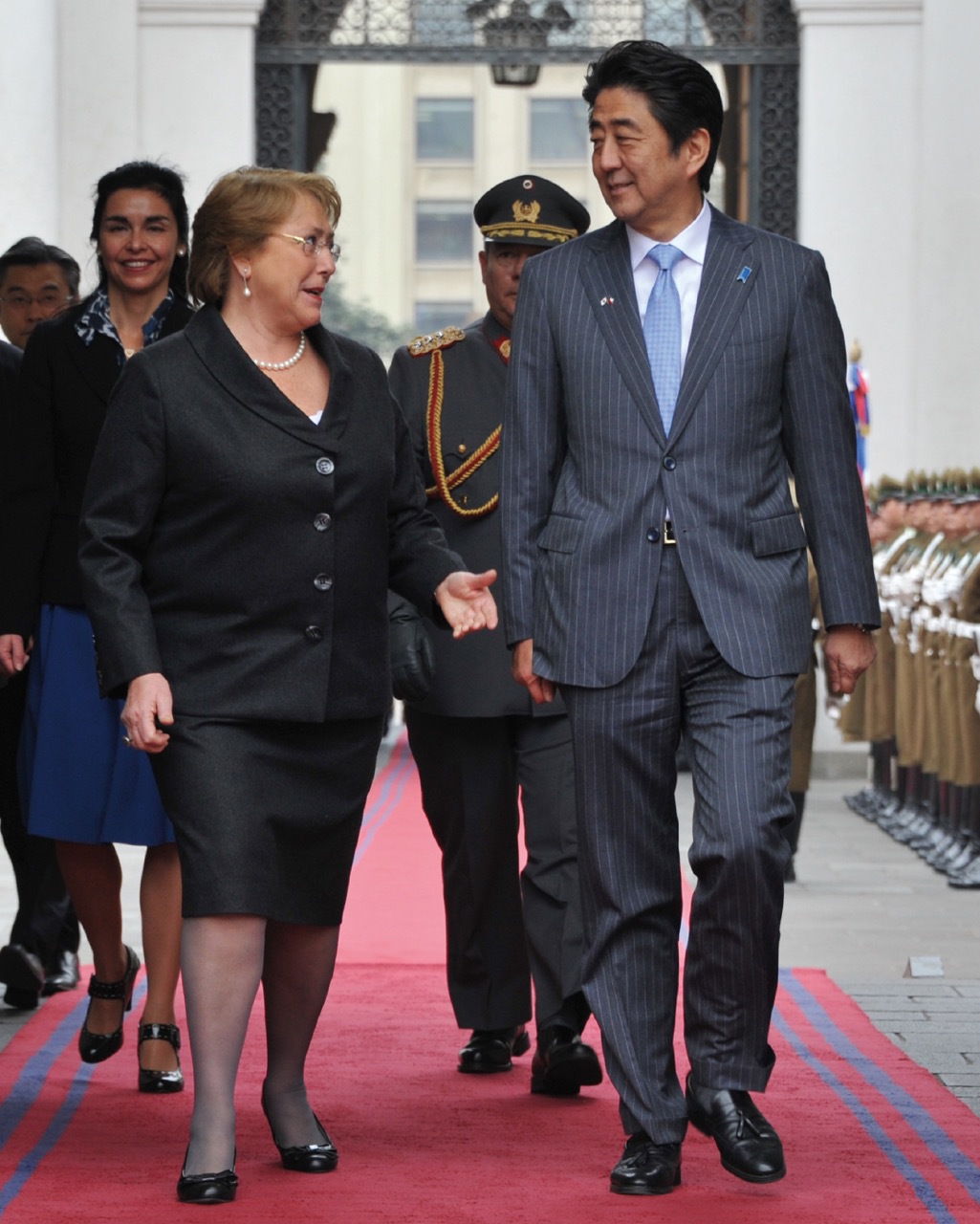 With Colombian President, Juan Manuel Santos, at their summit meeting. Abe’s visit was the first to Colombia by a Japanese prime minister. (July 2014)