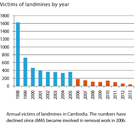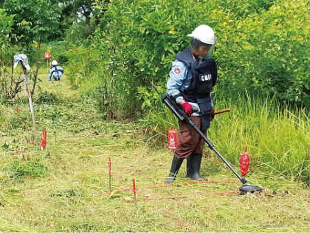 Upon retiring at the mandatory age of 55 from the Japan Ground Self-Defense Force (JGSDF), Imai joined the Japan Mine Action Service (JMAS), a nonprofit organization, at the invitation of a former superior officer. “I had the vague idea that I’d like to work overseas doing something that would benefit others,” he explains, “and when I heard about JMAS, where I could utilize the civil engineering and landmine removal skills I acquired while in the JGSDF, I eagerly applied.” A mere four days after his retirement, Imai arrived in Cambodia, where some four to six million landmines remained in the ground after the country’s long and bitter civil war and have claimed around 60,000 victims. Imai was posted to Battambang Province, one of the most mine-affected regions.