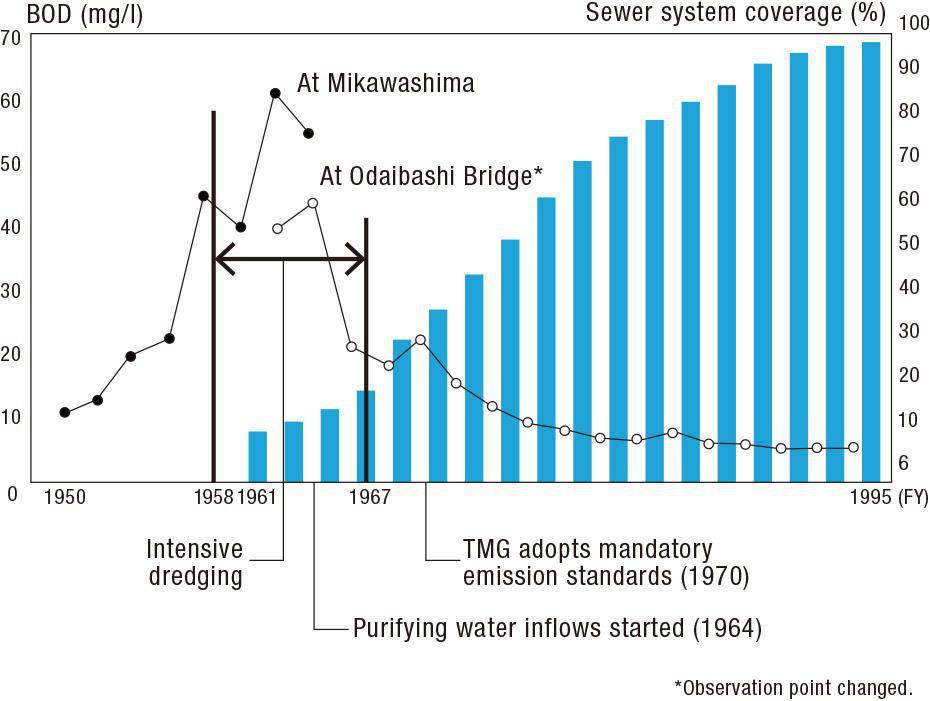 In the early 1960s the pollution of the Sumida River was at its worst, with biochemical oxygen demand as high as 63 milligrams per liter (mg/l). But since the mid-1980s the figure has been below 10 mg/l. And as pollution has declined, the river’s popularity has recovered.