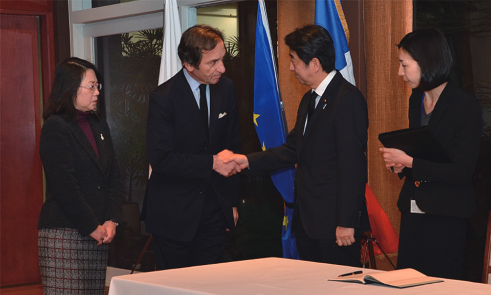 Prime Minister Shinzo Abe signing a book of condolences at the French embassy in Tokyo following the terrorist attack at the office of a satirical magazine in Paris. After signing the book, he expressed his sympathy for the victims and solidarity with the French people (January 2015).