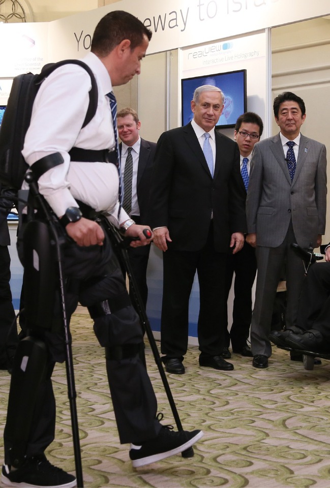 Prime Minister Abe with Israeli Prime Minister Benjamin Netanyahu visiting an exhibition by Israeli companies (January 2015).