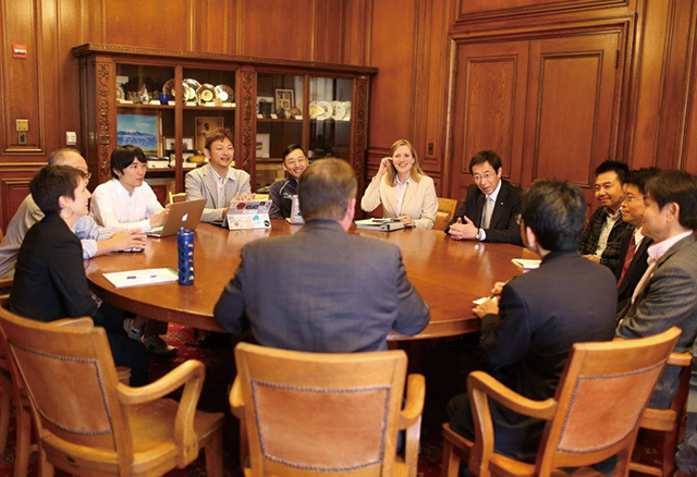 Dendy interprets during a meeting run by Mayor Kizo Hisamoto of Kobe (to her left) aimed at promoting the city internationally.