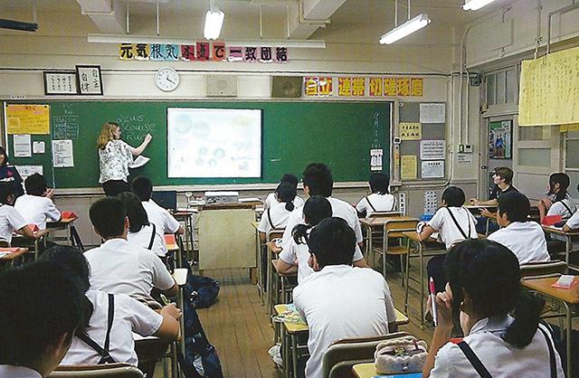 Dendy runs an English lesson while an ALT at a junior high school in Kobe.