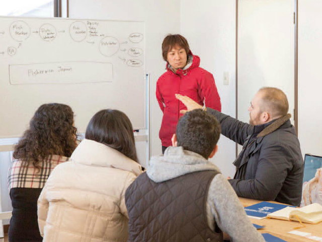 Five of the students visited a group of young fishermen and marine product retailers aiming to make changes in their industry. Yuki Tsuda runs fish shops based in Ishinomaki, Miyagi Prefecture, and he is working to raise the quality of marine products. “Branding, quality control, and marketing are important aspects of this business. I would like to establish unparalleled best practices that lead to a movement to increase the quality of all Japanese marine products.” Tsuda and his colleagues are looking for new markets at home and overseas and will branch out into Southeast Asia. “I want people in other countries to taste the fresh, high-quality fish we produce in Japan. And we also want to disseminate ways of eating fish and the culture associated with it to avoid having our products be thought of as ‘merely expensive.’”