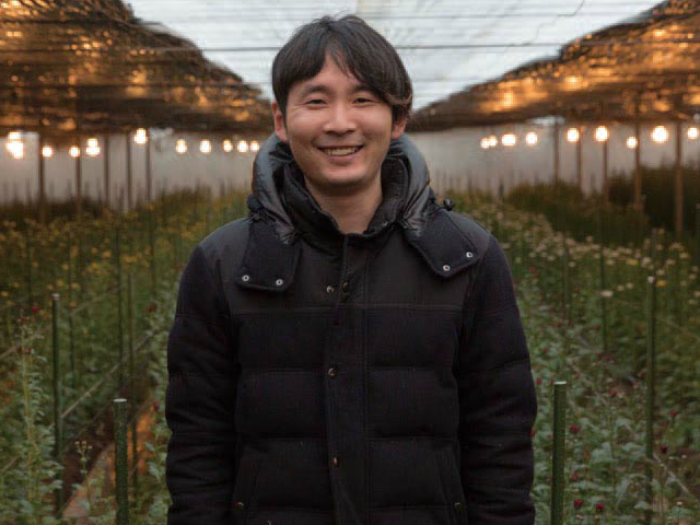 A smiling Ono shows the group his chrysanthemum greenhouse.