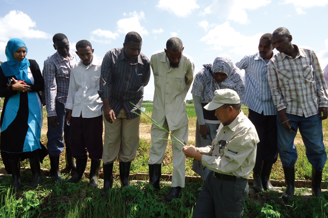 Tsuboi provides guidance in Uganda. In addition to guidance for farmers, Tsuboi, operating from a Nerica rice-growing test station in Uganda as his base, trains extension workers and researchers. He has trained over 2,000 such professionals in countries around Africa.