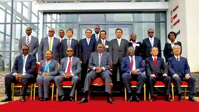 President Uhuru Kenyatta (seated at center) and other Kenyan government officials attended the opening ceremony of the Toyota Kenya Academy in July 2014.