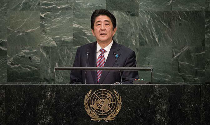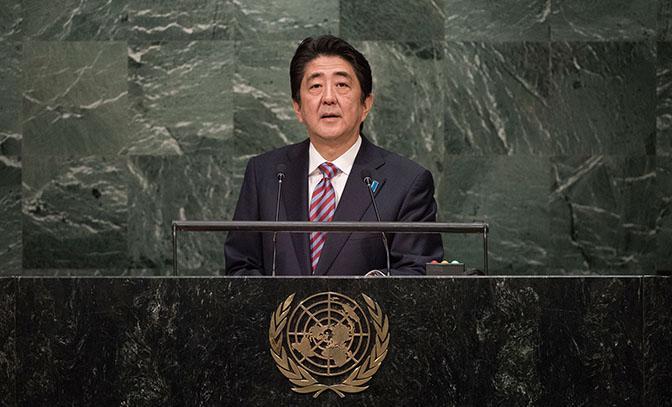 Prime Minister Abe gives a general debate address at the 70th session of the UN General Assembly (September 29, 2015).