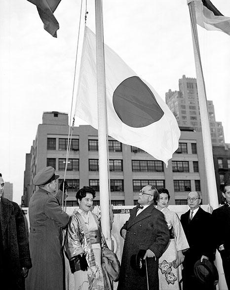 Japanese Foreign Minister Mamoru Shigemitsu observes the hoisting of the Japanese national flag to mark Japan’s accession to the UN (December 19, 1956).
