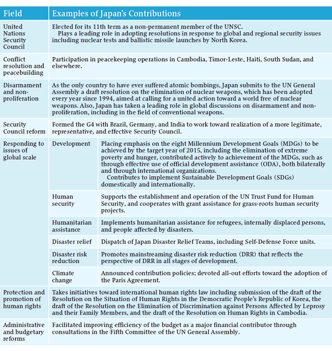 The year 2016 marks the 60th anniversary of Japan’s accession to the UN. Taking this opportunity, Japan will contribute even more actively in various fields centering on the UN’s three pillars of peace and security, human rights, and development, in close cooperation with other countries involved.