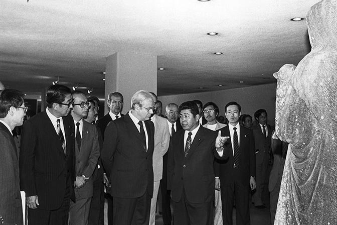 Nagasaki City Council member Yoshiaki Fukahori (gesturing) explains an exhibit to UN Secretary-General Javier Pérez de Cuéllar at the disarmament exhibition (far left: UN Under-Secretary-General for Public Information Yasushi Akashi and Japanese Foreign Minister Shintaro Abe) (September 28, 1983).