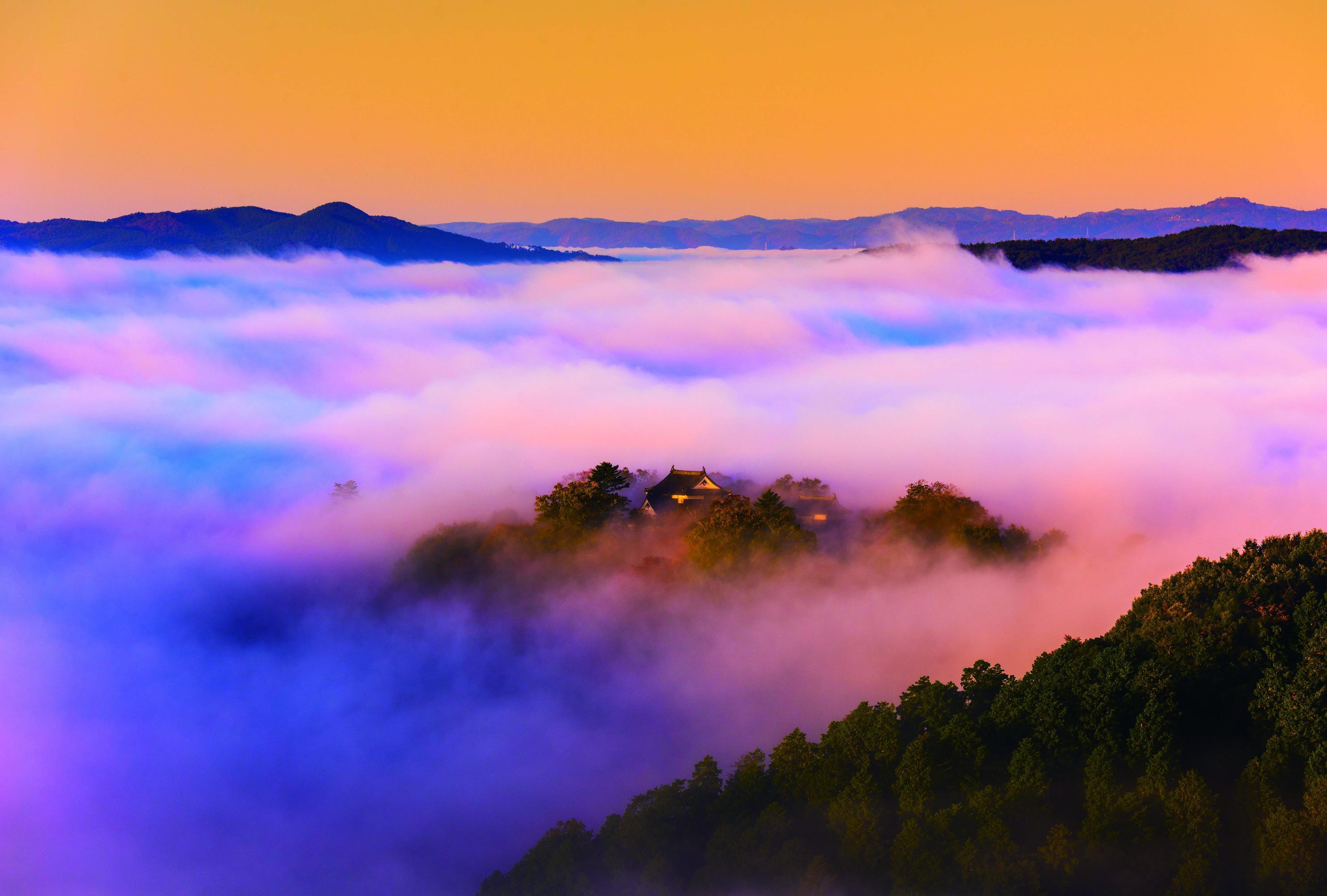 Bitchu Matsuyama Castle is about an hour’s drive from the prefectural capital of Okayama. Built near a summit at an elevation of 430 meters (about 1,400 feet), it is the highest among the mountain castles of Japan that have their original donjon. From autumn to winter, the surrounding basin is sometimes shrouded in morning mist, becoming a magnificent sea of clouds. This phenomenon only occurs for a few hours around sunrise on days when the weather is fair and the temperature has fallen sharply at dawn. But when it happens, a fantastic panorama comes into view as the rays of the rising sun strike the castle, which seems to float in the sea of clouds under the crisp, clear sky.