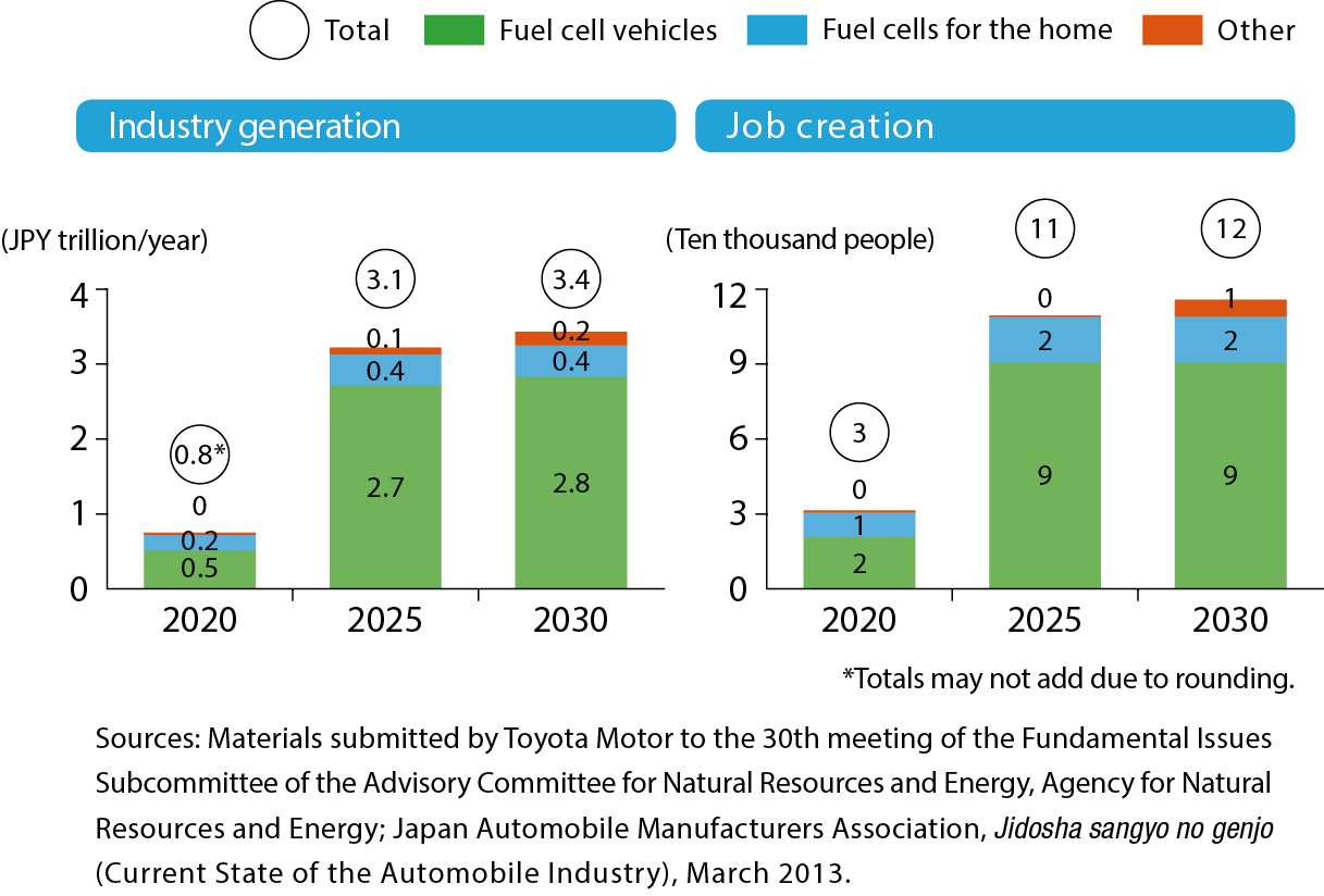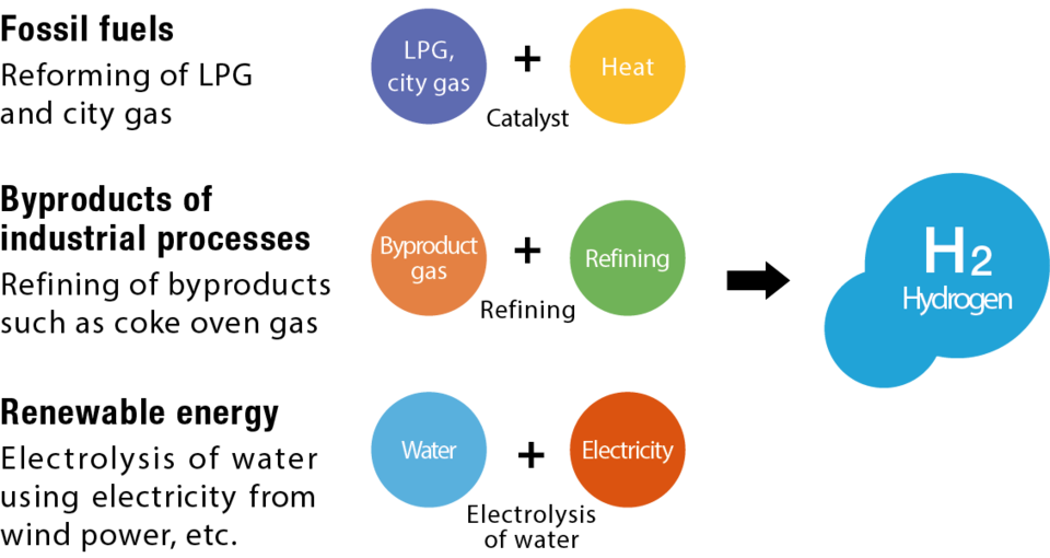 The creation of a hydrogen society aims at achieving four major objectives. First is the reduction of the burden on the environment. Unlike fossil fuels, hydrogen emits only water when burned. So it promises to greatly cut emissions of carbon dioxide. Second is the diversification of energy sources. Hydrogen can be produced with renewable energy sources, and its use will also promote stability in the supply of energy. Third, it will generate beneficial economic ripple effects. The shift to a new energy source will naturally mean new demand and new jobs. And fourth, it can help in coping with natural disasters. Fuel cell cars generate electricity to power their motors using hydrogen from their tanks, and when disasters cause power outages, these vehicles can serve as large-scale movable generators. This adds to the appeal of hydrogen for Tokyo, which is highly conscious of the importance of disaster readiness.