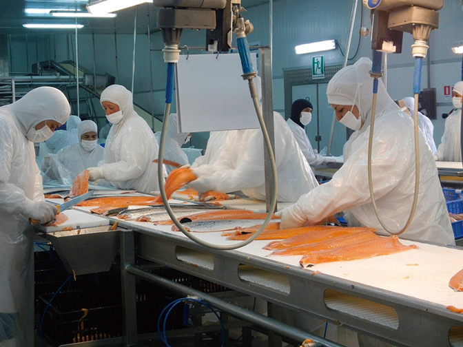 After being processed in local factories, large salmon raised in pens are exported from Chile to dinner tables around the world.