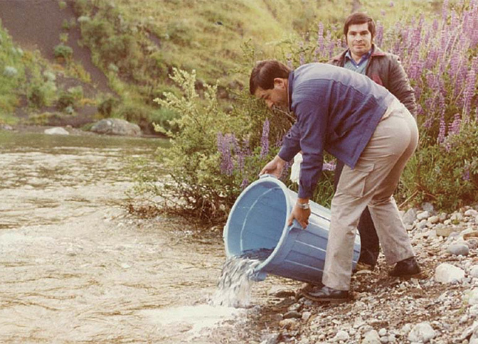 The history of these ties goes back about half a century. The Chilean government was searching for ways to help small fishing businesses, and Japan was looking for new supply sources for salmon. So the interests of the two sides meshed. In 1972 the Japan-Chile Salmon Project began with the aim of farming and releasing young salmon. Hidemitsu Sakurai, head of the Japan International Cooperation Agency (JICA) office in Chile, who was involved in the project from 1985 to 1987, recalls, “The purpose of the project was to bring Japanese salmon to Chile and establish this fish as a marine resource here. First of all, therefore, we decided to bring salmon eggs over from Japan, hatch them, and release the young fish into a river in Chile, aiming to have them return there.” JICA experts dispatched to Chile directed the construction of a hatchery, and starting in 1974 chum salmon were hatched and released. These efforts continued for several years, but the objective of having the salmon return was not achieved. In order to increase the possibility that the salmon would return and thus sustain the project, the JICA experts considered ways of producing salmon eggs in Chile. They adopted the method of ocean farming, hatching chum salmon in fresh water and then transferring them to a pen in the sea, where they were raised to adult fish so as to serve as a source of eggs. In 1982 they succeeded for the first time in producing eggs from locally raised chum salmon. They hatched the eggs and released the young fish. Though some of them returned, even this ocean-farming method did not succeed in establishing the chum salmon as a local marine resource within the given timeframe. However, the trial use of a pen in the sea for raising the fish served as a highly valuable experience for Chilean technicians.