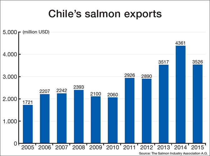 Chile is the world’s second-largest exporter of salmon after Norway. Salmon exports amounted to approximately USD 3.5 billion in 2015, and the top destination was Japan, which accounted for 25% of the total value. Chile’s salmon industry, including processing, employs about 70,000 workers, and it has become a key component of the country’s economy. Japanese assistance from both the public and private sectors has had much to do with the origins and development of salmon farming in Chile, so much so that people now talk about the “salmon ties” between the two countries.