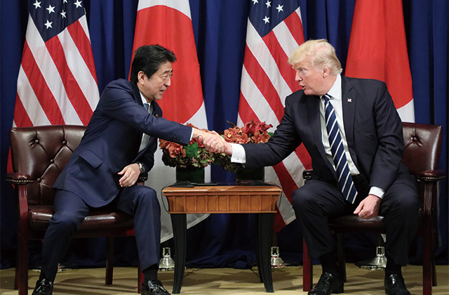 Meeting with the Honorable Donald J. Trump, President of the United States of America, and H.E. Mr. Moon Jae-in, President of the Republic of Korea, in New York. The three countries’ leaders shared the view that amid the growing threat of North Korea, they must deepen collaboration under the unity of the three countries, such as by increasing efforts to encourage joint pressure from the international community. (September 2017)