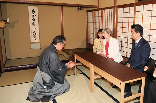 Visiting the city of Kyoto with the Rt. Hon. Theresa May MP, Prime Minister of the United Kingdom of Great Britain and Northern Ireland, where they conversed while participating in a tea ceremony at Fushin’an, the historic tea room of the Omotesenke school which descended directly from Rikyu Sen, the founder of Japanese tea ceremony. (August 2017)