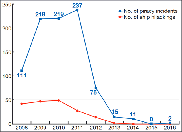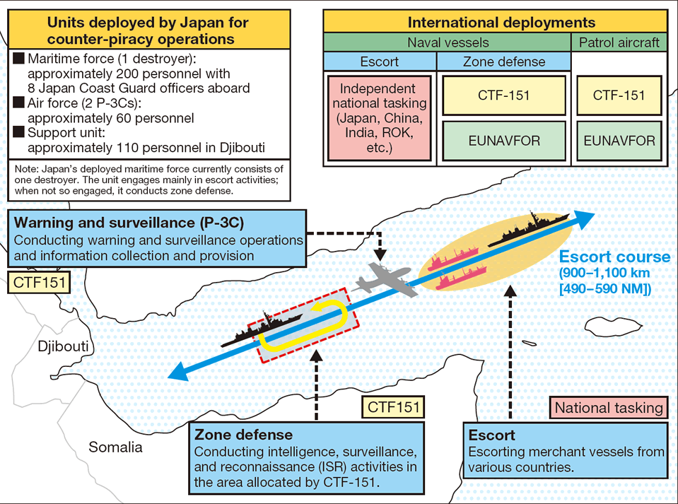 A choke point for maritime transport between East Asia and Europe lies in the Gulf of Aden off the coast of Somalia, through which about 17,000 ships are said to navigate every year. But from around 2008 on, there was a sharp increase in attacks on merchant ships in these important waters by ransom-seeking pirates. Among the causes of piracy were the political turmoil and poverty in Somalia. The safety of maritime shipping, which plays a major role in international trade, is crucial for Japan. In view of this, and in order to contribute internationally, since 2009 Japan has deployed destroyers and patrol aircraft from the Japan Self-Defense Forces (JSDF) to escort ships and conduct surveillance in the Gulf of Aden. These activities are conducted without regard to the ships’ nationality, and over the eight years of the deployment the Japanese forces have escorted some 3,900 merchant ships through these waters.